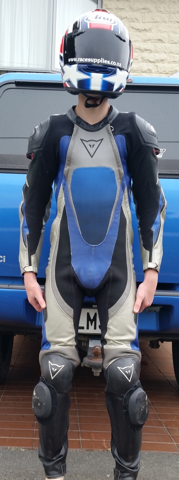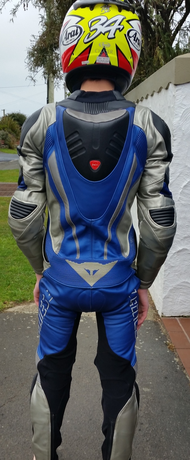 High end model Dainese one piece race suit. The model is Titanium and the size of this suit is Euro 46 (yes quite small) My kids have grown out of these, will fit someone around 160-165 cm tall and 50-55 kgs.